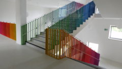 The design, which Arch.Design prepared, includes the interior design which is generally more “fun” when compared with the conservative facade. The reason is that the interior is intended for the younger pupils. A distinct element in the generous open space of the corridors is the railing of the main staircase. Its colour scheme was achieved by using a variable, grading colour range. On top of that, the room entrances, building entrances and the individual functional areas are highlighted. The decorative design concept of the individual elements is not a purely aesthetic matter, but shall primarily improve orientation in space.